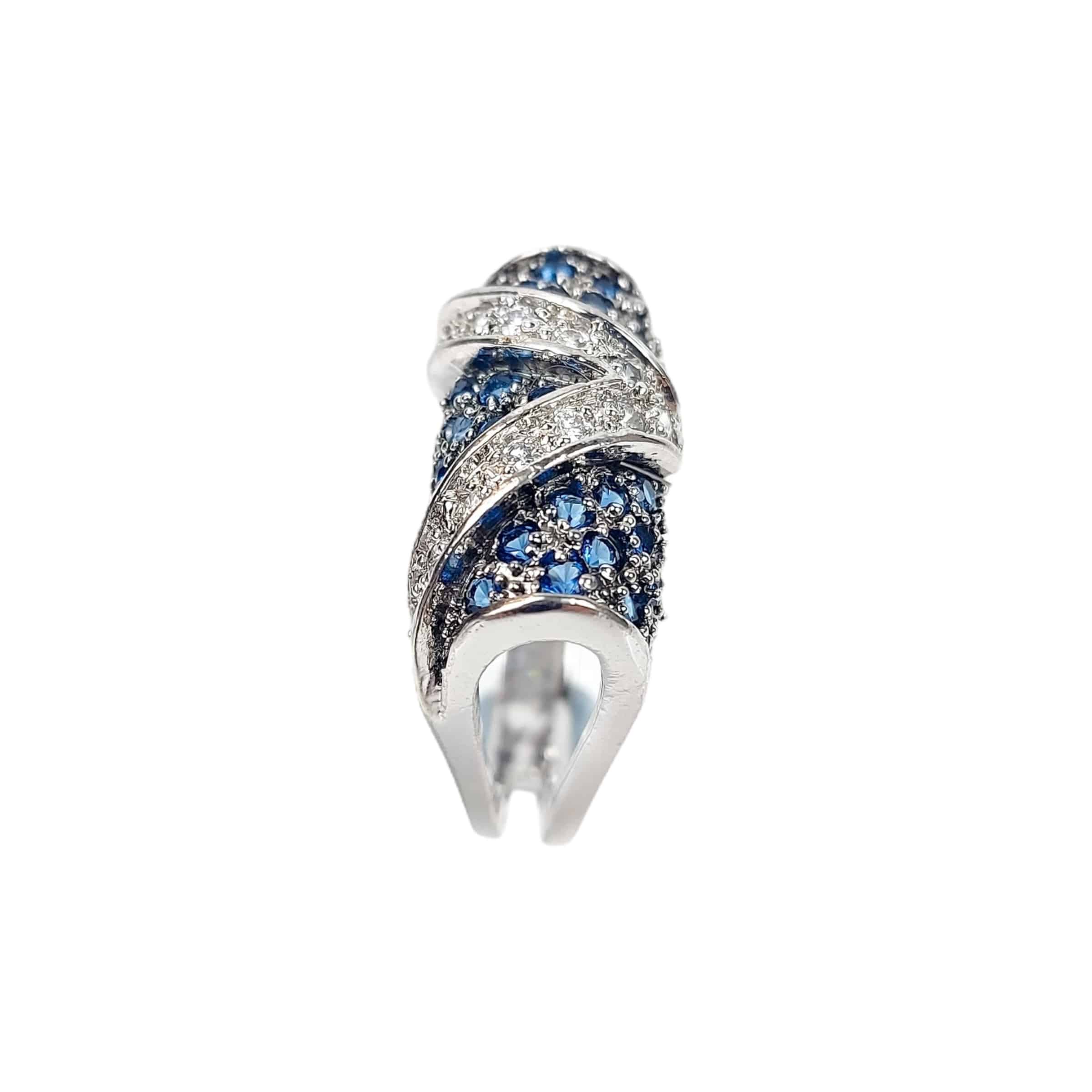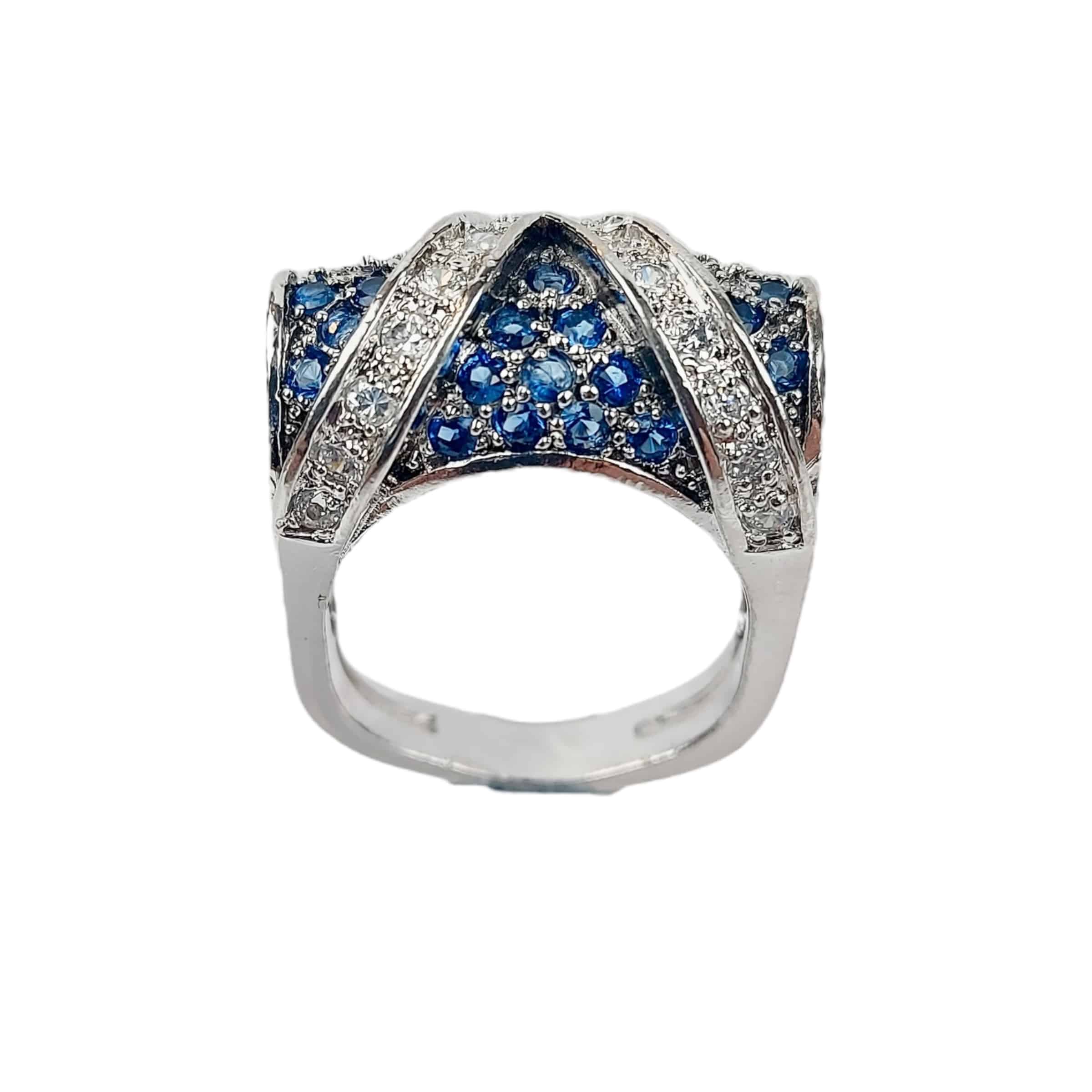 Kék és fehér kövekkel díszített széles gyűrű mely egy táska formát ábrázol amely királyi eleganciát sugároz.